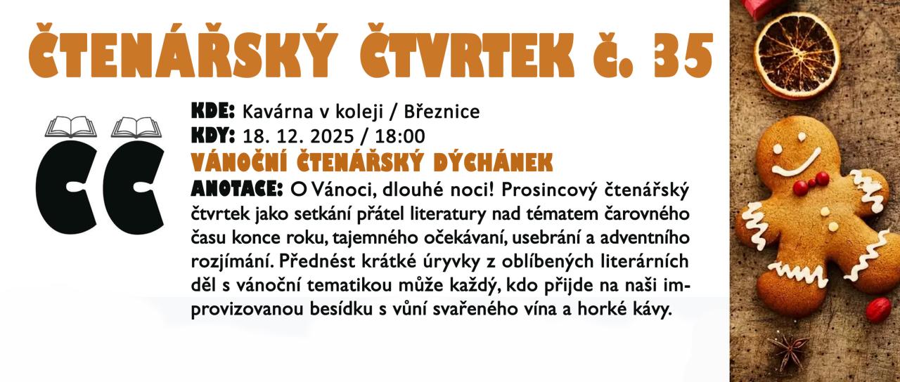 Prosincový čtenářský čtvrtek jako setkání přátel literatury nad tématem čarovného času konce roku a adventního rozjímání. Přednést krátké úryvky z oblíbených literárních děl s vánoční tematikou může každý, kdo přijde na naši improvizovanou besídku. Těšíme se!