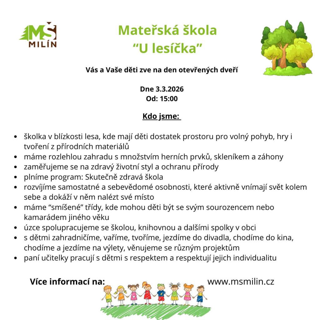 Den otevřených dveří v Mateřské škole MILÍN „U lesíčka“ se uskuteční 3. března 2026 od 15:00. Školka se zaměřuje na zdravý životní styl a ochranu přírody. Děti mají možnost se věnovat různým aktivitám, jako je zahradničení, vaření a tvoření.
