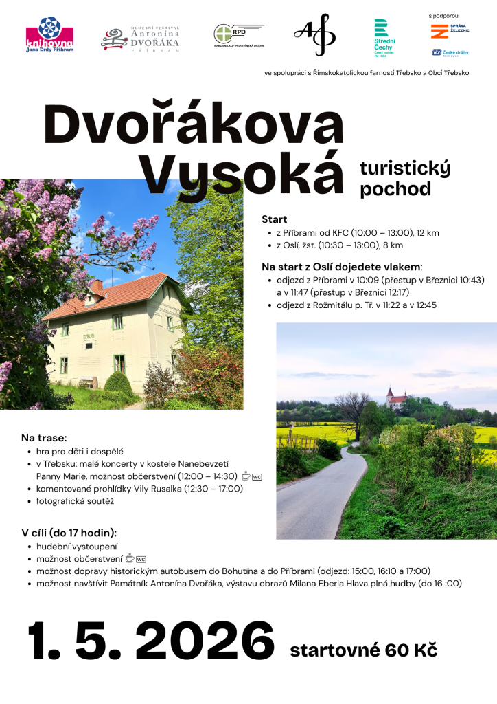 Termín turistického pochodu letos připadá opět na 1. května, takže prvomájový výlet můžete strávit aktivně v přírodě. Kam se vydáme? Kromě osvědčené trasy z Příbrami se mohou účastníci těšit na premiérový start z Oslí. Do této vísky u Chrástu se svezete vlakem buď z Březnice nebo z Rožmitálu pod Třemšínem a vyrazíte přímo ze zastávky (start mezi 10.30 a 12.30). Na turisty čeká 8 km přírodou až do Památníku Antonína Dvořáka ve Vysoké u Příbramě.