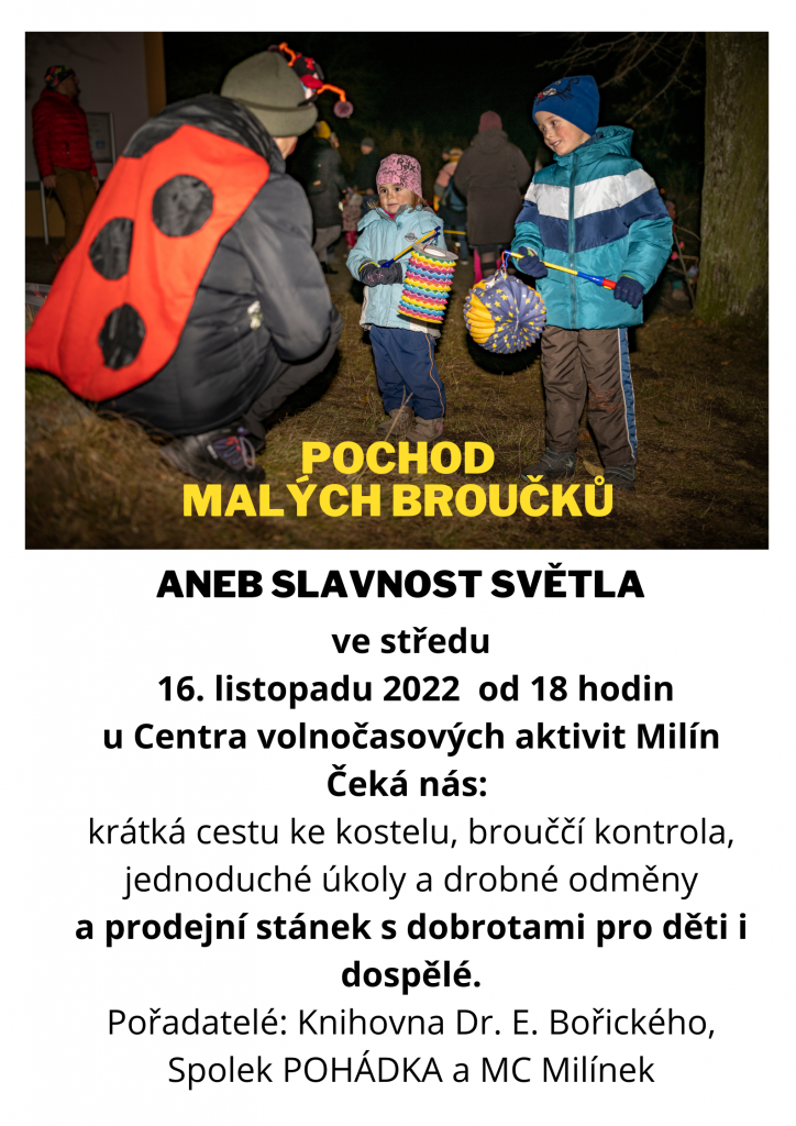 Spolek Pohádka ve spolupráci s Knihovnou Dr. E. Bořického pořádá ve středu 16. listopadu 2022 od 18 h Slavnost světla neboli Pochod malých broučků. Začátek akce je před budovou Centra volnočasových aktivit Milín. Předpokládaný konec do 19.30 hodin. Již tradičně uvítáme účastníky v brouččích kostýmech a stejně tak se těšíme na příchod malých i velkých broučků a všelijakého hmyzu. Přivítáme i brouččí miminka a kukly v kočárcích. Kdo bude svítit, ten lépe uvidí! Účastníky čeká krátký pochod ke kostelu sv. Václava a pak návrat zpět ke knihovně. Na závěr se všichni posilní sladkým teplým nektarem, případně i nějakým pálivým pylovým extraktem. Na prodej budou různé dobrůtky ve stánku paní Aleny.