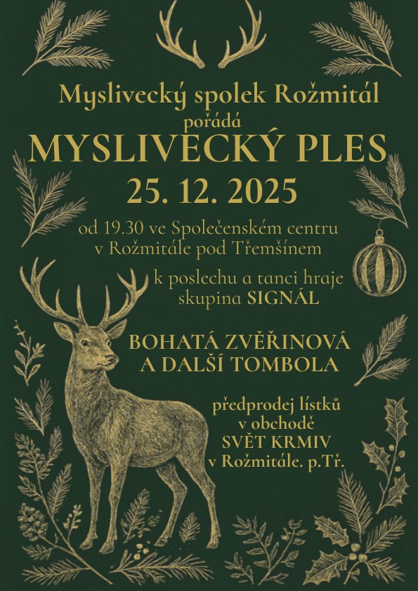 K poslechu a tanci bude hrát skupina Signál. Připravena bude bohatá zvěřinová tombola. Začátek plesu je v 19:30. Předprodej vstupenek probíhá v obchodě Svět krmiv v Rožmitále pod Třemšínem.