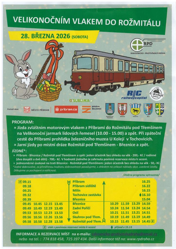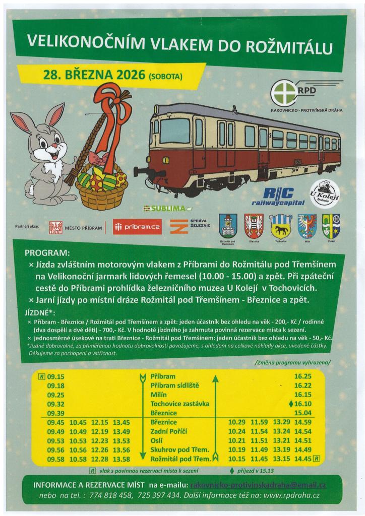 Rakovnicko-Protivínská dráha vás zve na jízdu zvláštním motorovým vlakem z Příbrami (zastávka v Milíně) do Rožmitálu pod Třemšínem a zpět. Akce se koná v sobotu 28. března 2026. Během jízdy navštívíte Velikonoční jarmark a železniční muzeum U Kolejí. Více informací na plakátu.